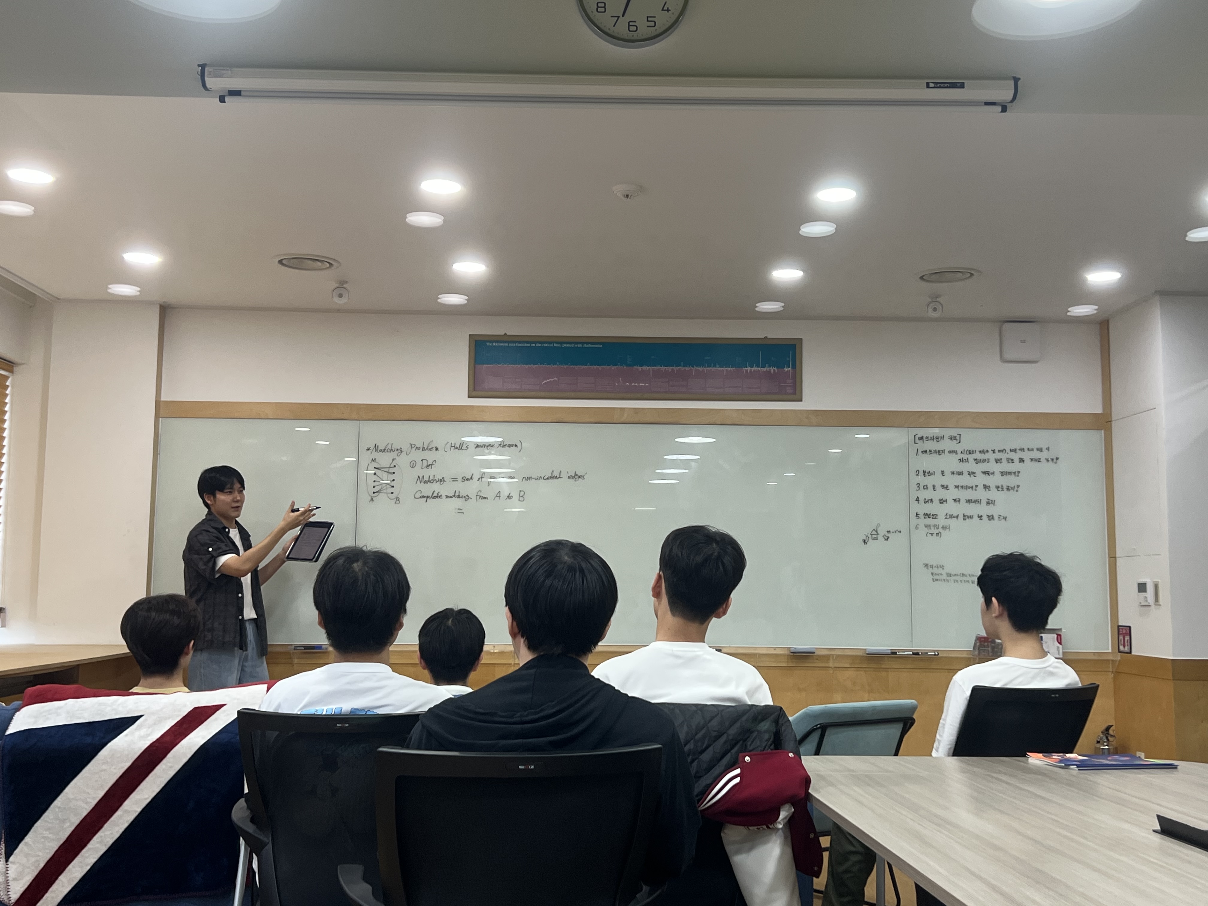 김현성 학생은 접공간의 대수학적 정의에 대해 설명하며 수학의 추상적 개념이 어떻게 구조화되는지를 소개하였고, 정윤제 학생은 산업경영공학과에서의 연구 참여 경험을 바탕으로 융합 연구의 사례를 전했다. 이태용 학생은 일반위상수학에서 배울 수 있는 내용을 주제로 수학의 이론적 깊이를 소개하였고, 박태준 학생은 이산수학의 Matching Problem을 중심으로 흥미로운 문제 해결 과정을 공유하였다.