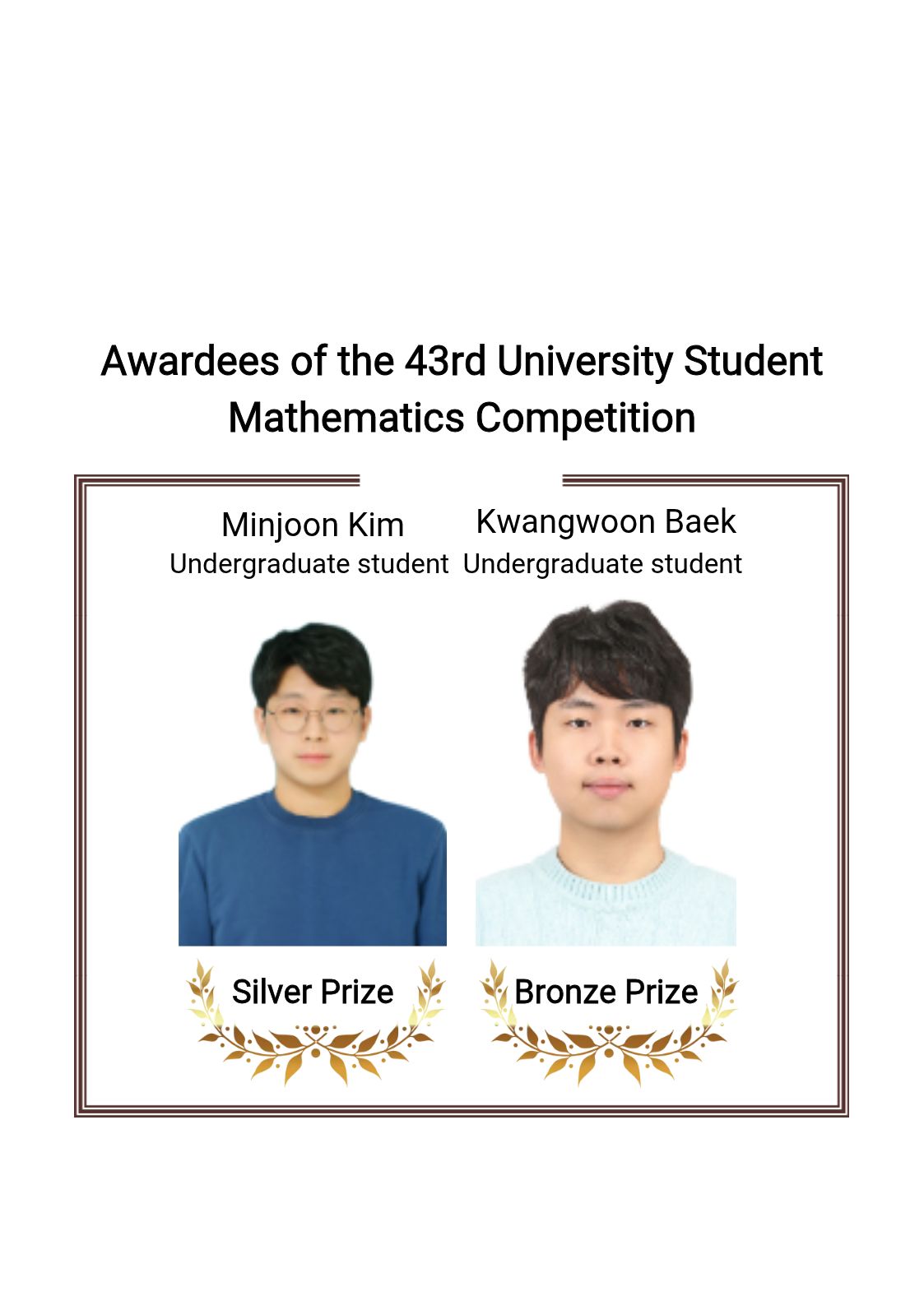 [Awards and Honors] Awardees of the 43rd National Collegiate Mathematics Competition (Minjoon Kim and Kwangwoon Baek)