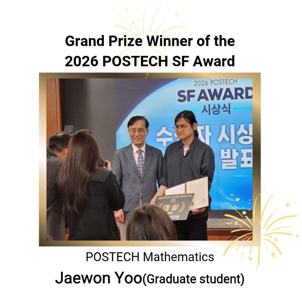 Graduate student Jaewon Yoo from the Department of Mathematics received the Grand Prize in the short story category at the “2026 POSTECH SF AWARD,” held on February 27, 2026, in the Main Building Conference Hall at POSTECH.